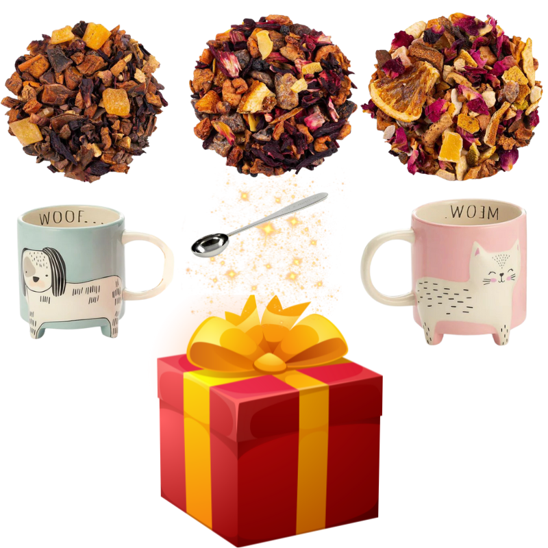 Ovaj pažljivo odabrani paket sadrži 3 božićna čaja od 50g, dvije šalice "Maca" i "Psić" te žličicu za čaj "Savršena":