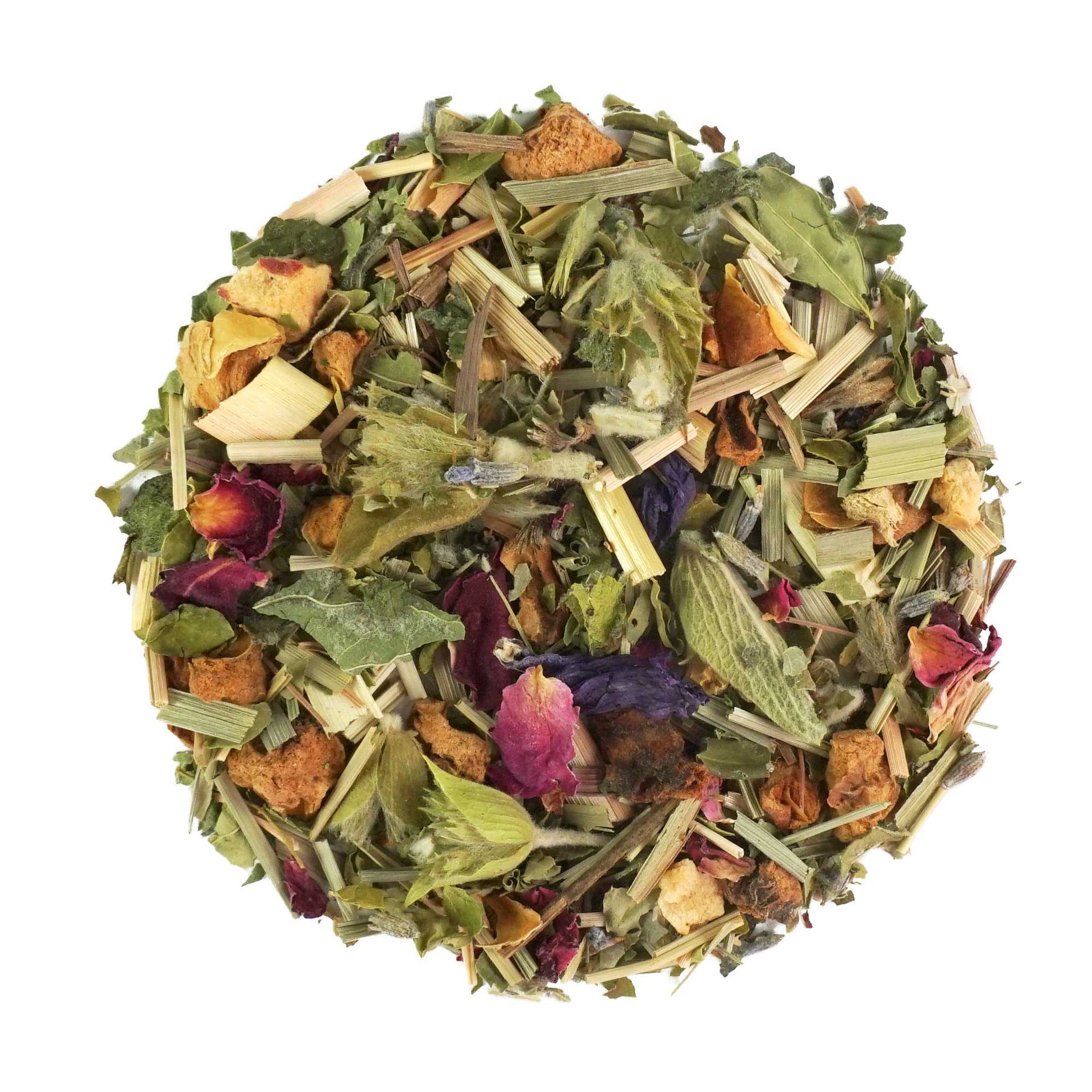 Sastojci: limunska trava, jabuka, listovi morige, verbena, matičnjak, Sideritis, korijen sladića, latice ruže, aroma, jabučna metvica, lavanda, pupoljci ruže, kardamom, sljez, prirodna aroma latica naranče, prirodna aroma ruže.